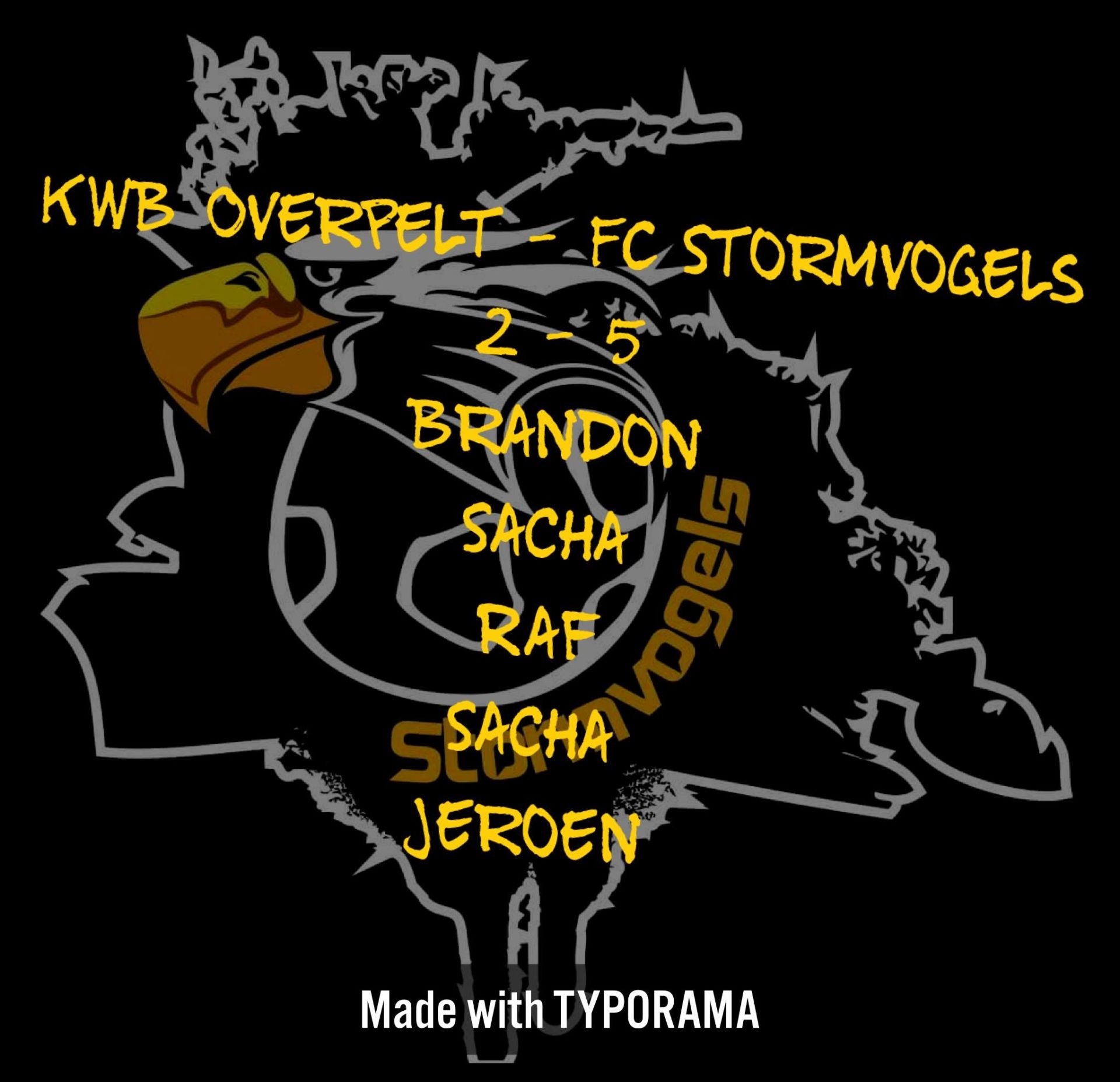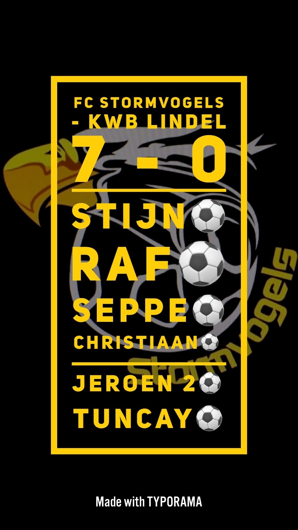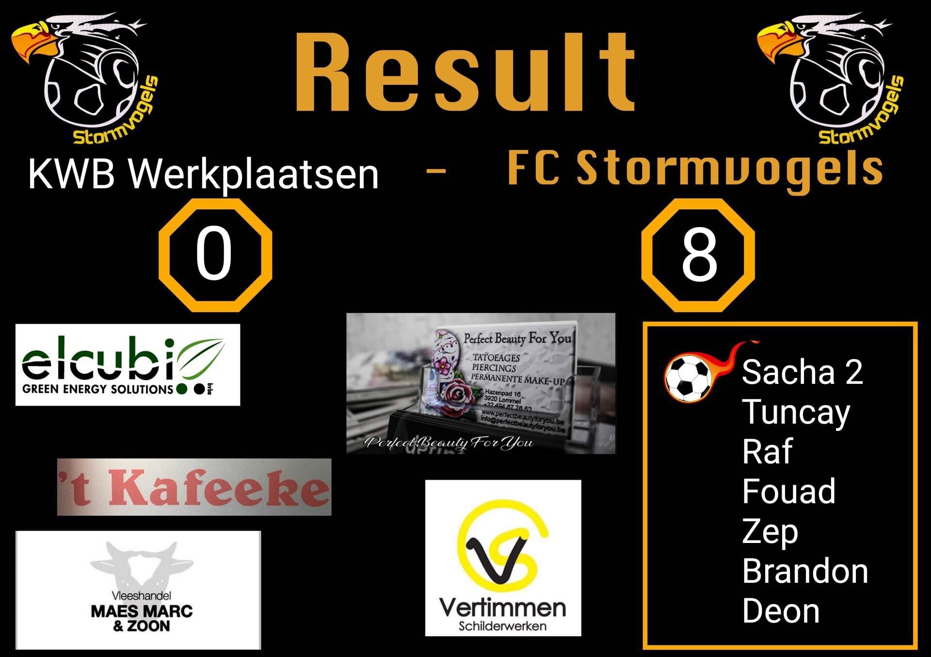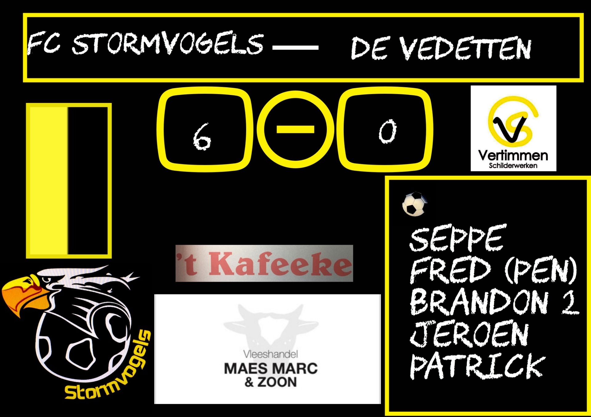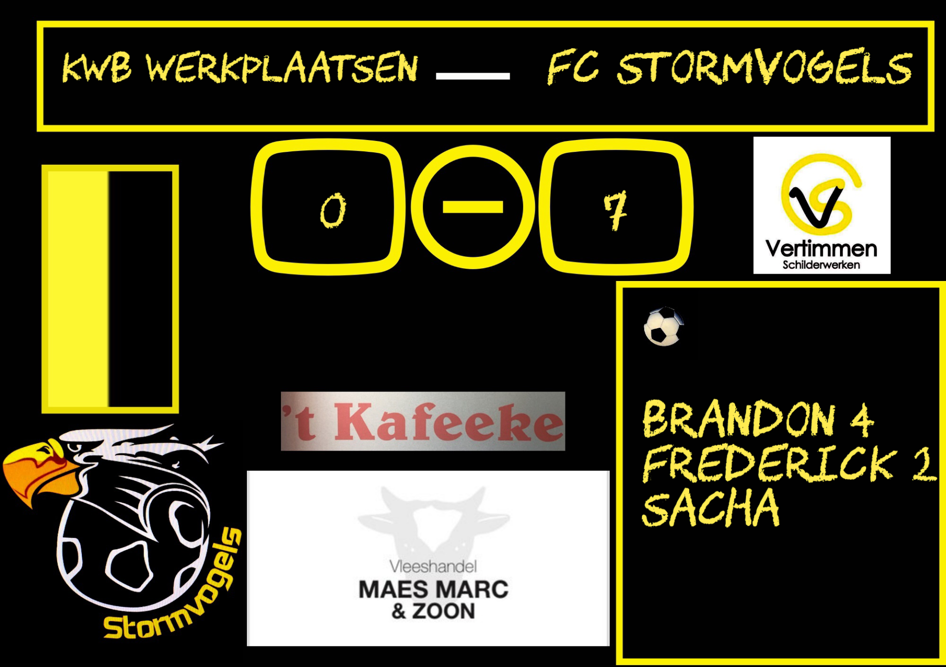 Een zeer goede match, sterk collectief van de Stormvogels. Andere ploeg kwam er niet aan de pas! 0 - 6 gewonnen met prachtige uitgevoetbalde doelpunten.