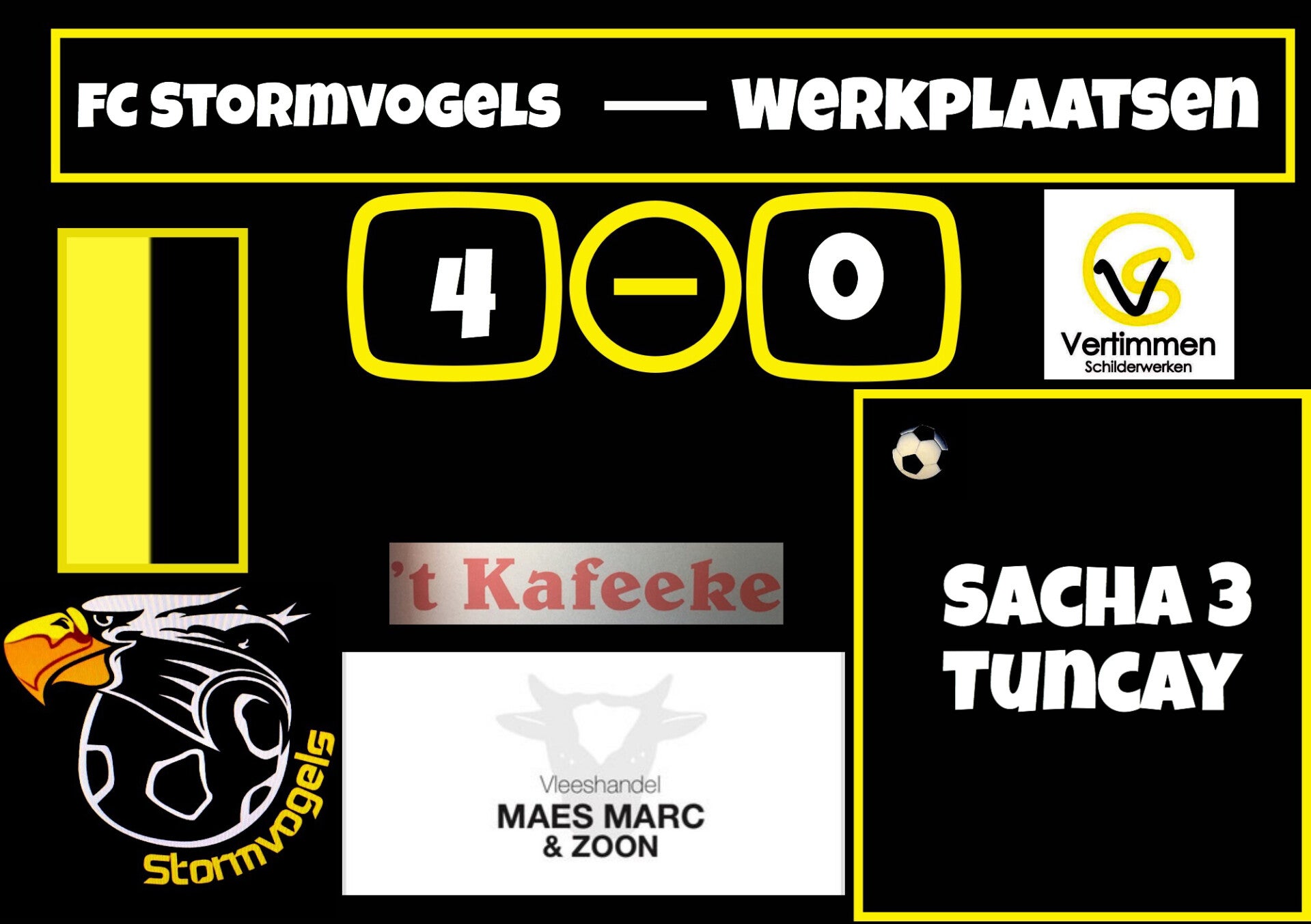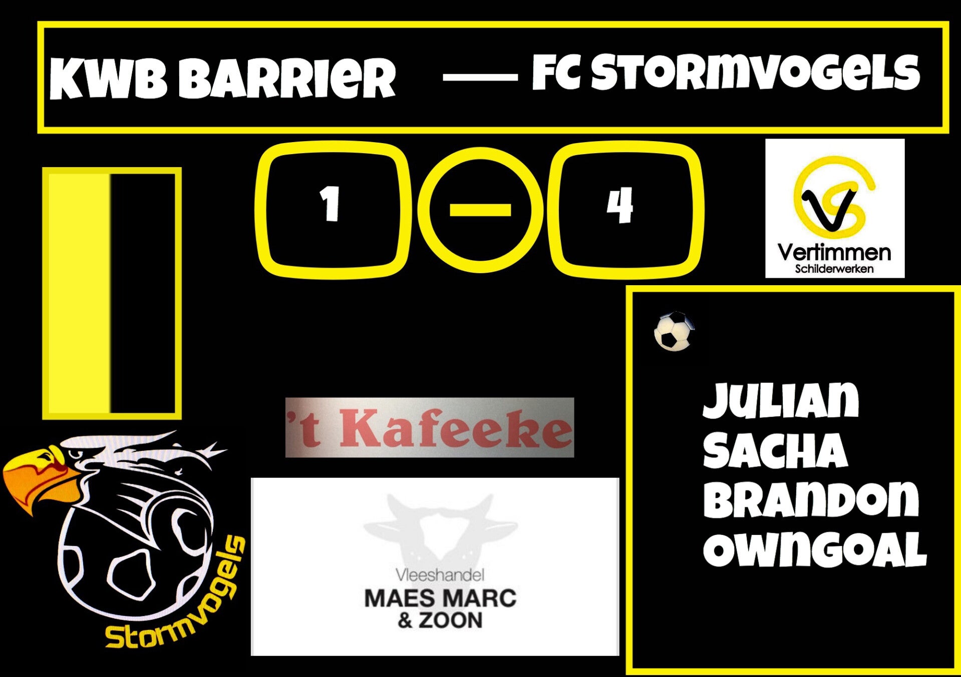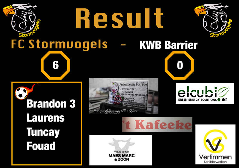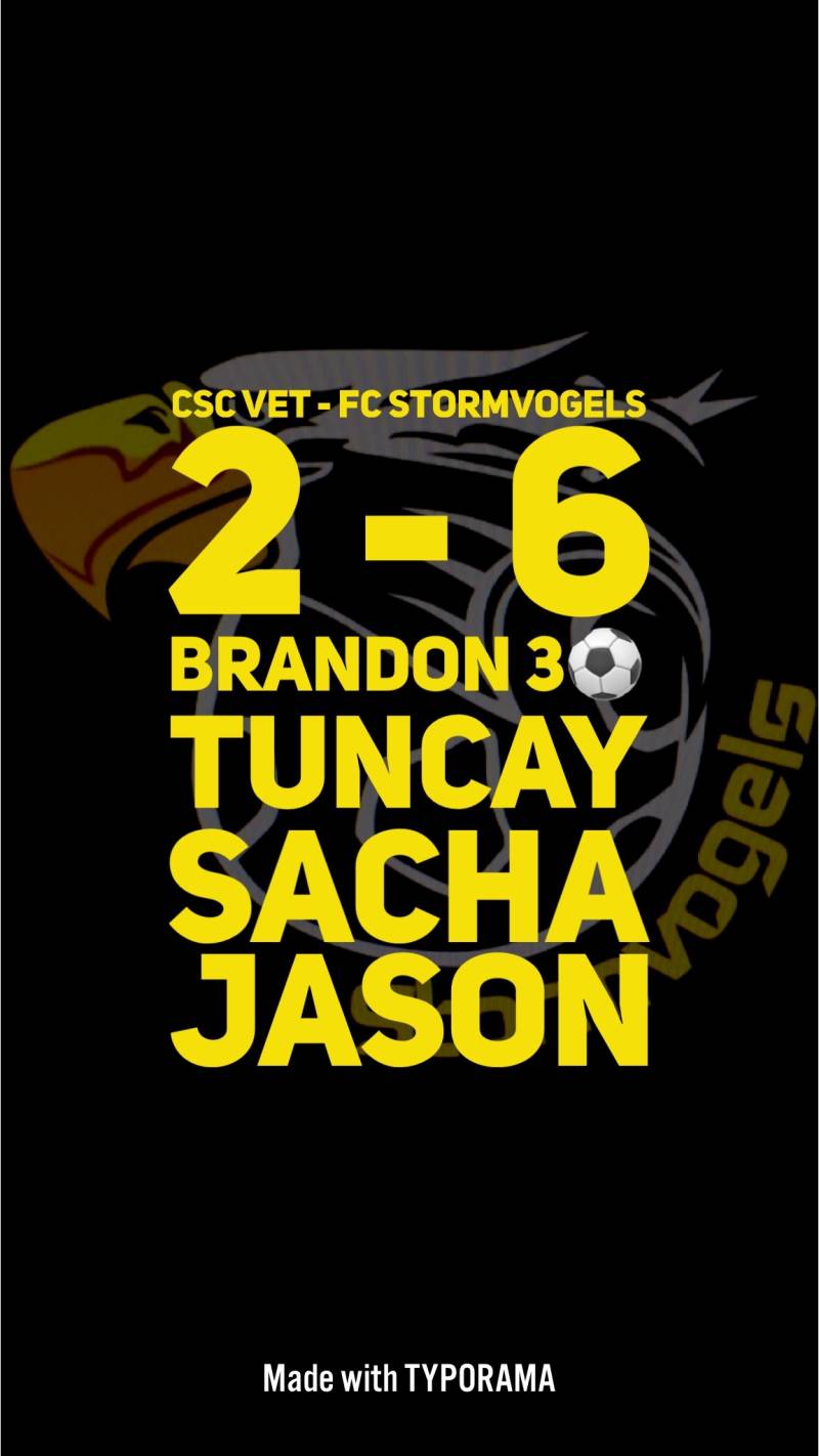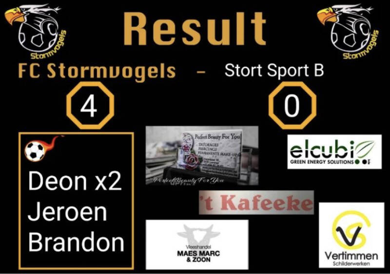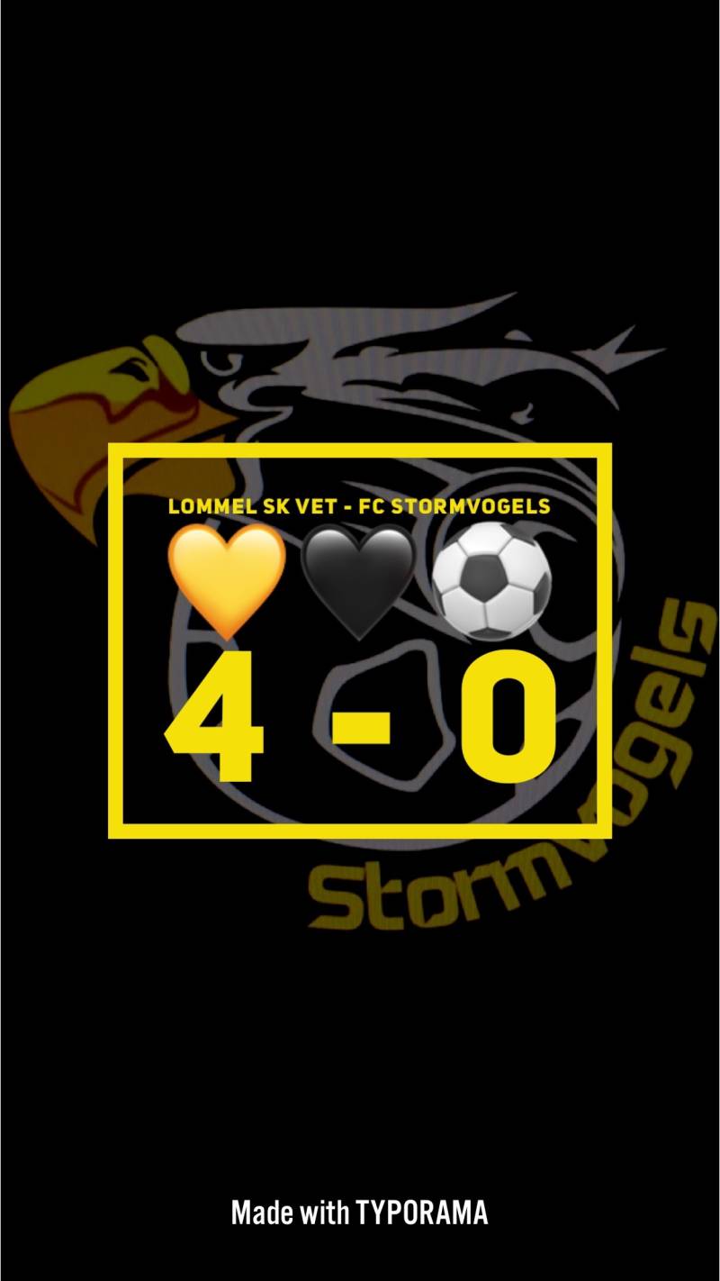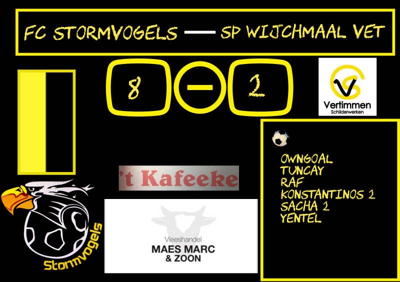 Een zeer goede match, sterk collectief van de Stormvogels. Andere ploeg kwam er niet aan de pas! 0 - 6 gewonnen met prachtige uitgevoetbalde doelpunten.