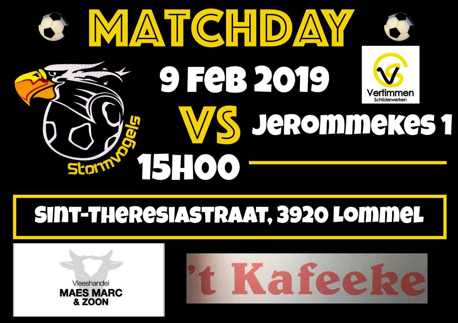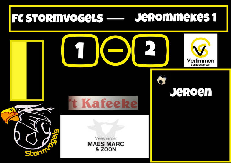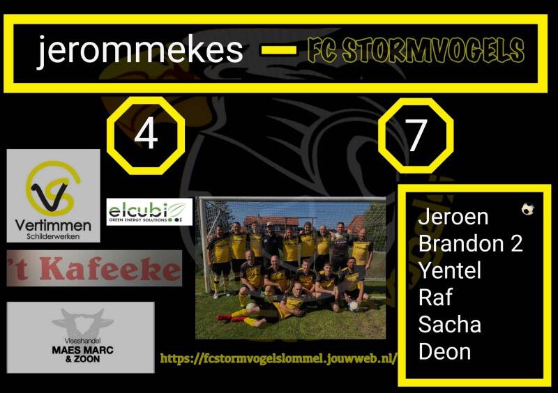 Begonnen sterk aan de wedstrijd. Tegen een goed voetballende ploeg gingen we met 0 - 2 voorsprong de rust in. Kort in de tweede helft liepen we al snel uit naar 0 - 4. Ondanks een voorsprong van 0 - 5 of 0 - 6 lieten we de Jerommekes toch terugkomen naar 4 - 5 of 4 - 6. Zij bleven druk zetten, maar lieten zo achteraan veel ruimte vrij en zo maakten we ze via een counter af met de 4 - 7.