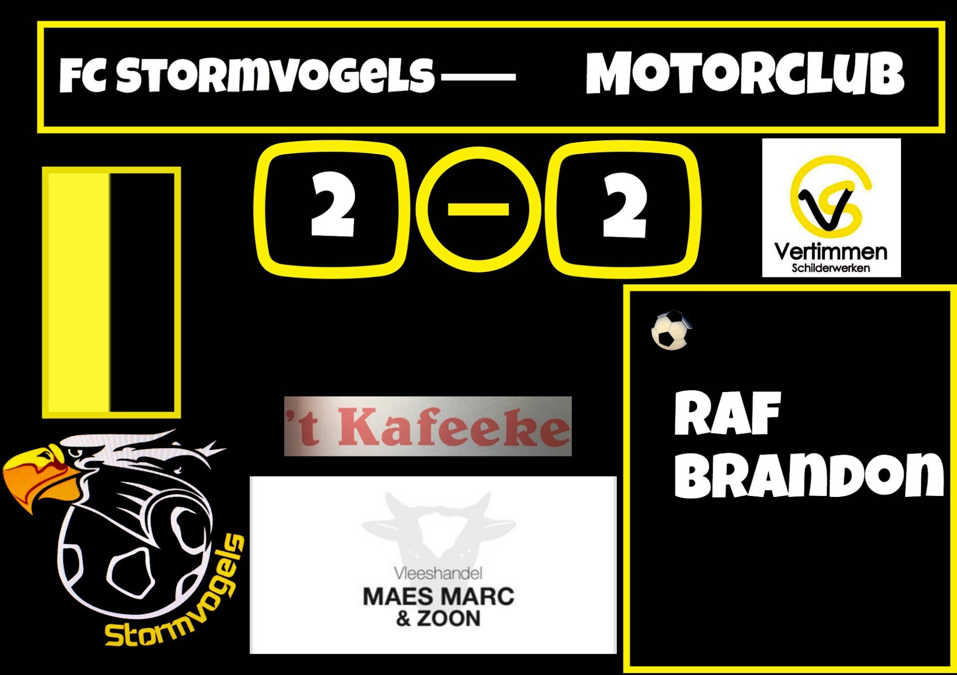 Balbezit was duidelijk voor Motorclub, creëerden een tal van kansen, een trap op de lat en miste ook een penalty. We hielden geruime tijd stand, ook al was het op slag van drankpauze 1 - 0 geworden. We bleven jagen achter te bal, zo kon Tuncay druk zetten op de keeper, de bal afsnoepen en de 1 - 1 binnen tikken. Het was pompen of verzuipen, Yentel hield nog 2 keer de bal tegen op de lijn, helaas lukte hem dit geen 3e keer. 2 - 1 viel in het laatste kwart van de wedstrijd. Met maar juist spelers genoeg, hebben we gestreden voor wat we waard waren. Forza FC Stormvogels!!